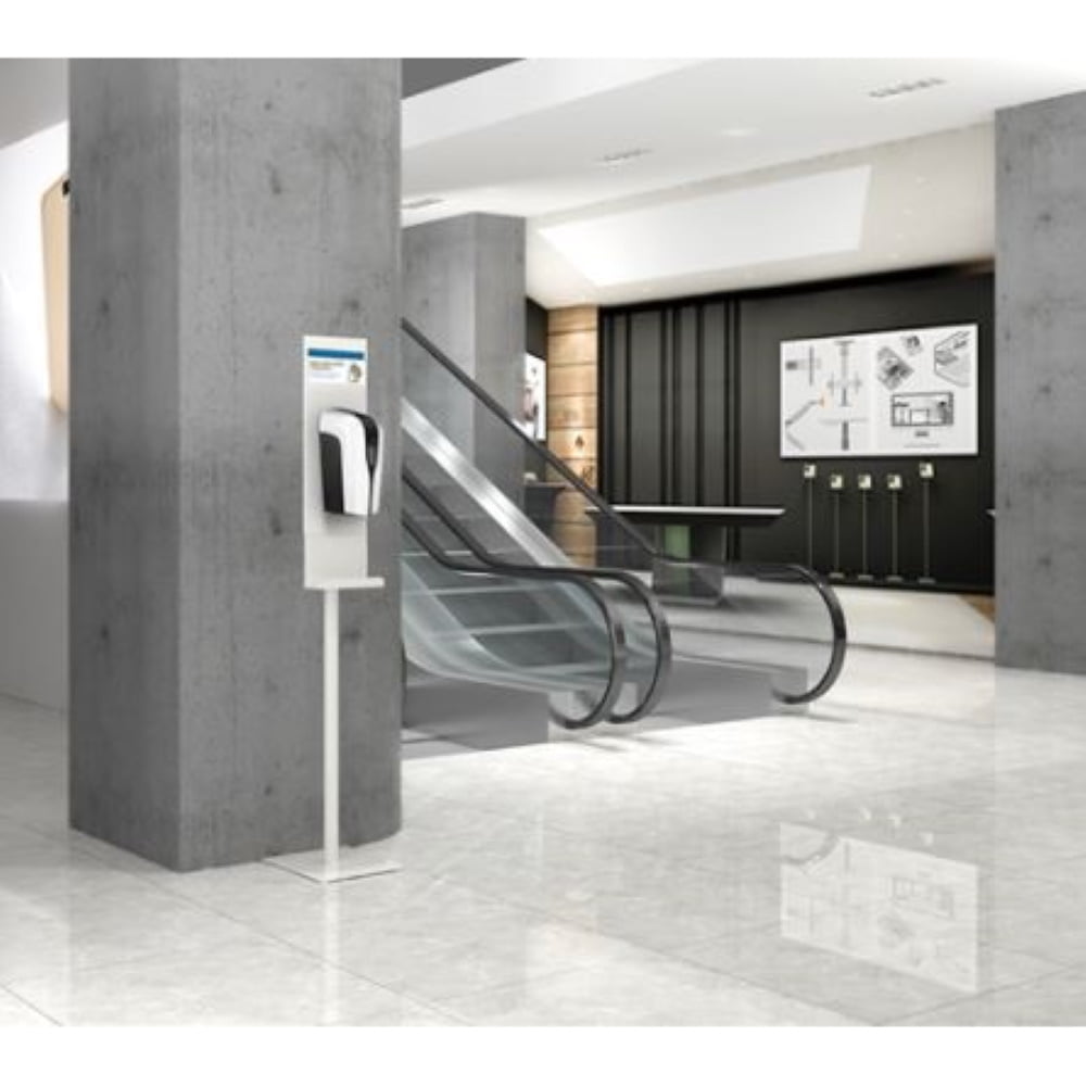 Soveltuu erityisesti ravintoloihin, ostoskeskuksiin ja muihin paljon ihmisiä sisältäviin paikkoihin. Teline soveltuu useimmille markkinoilla oleville annostelijoille. Se sisältää kaukalon, joka estää yli jääneen päätymisen lattialle. Etupaneelissa on tilaa brändäykselle tai muulle grafiikalle. Tuotteessa on metallinen jalusta, joka tekee siitä vankan ja turvallisen käyttää.