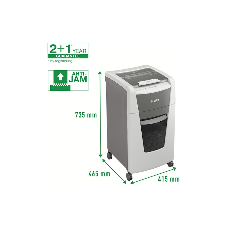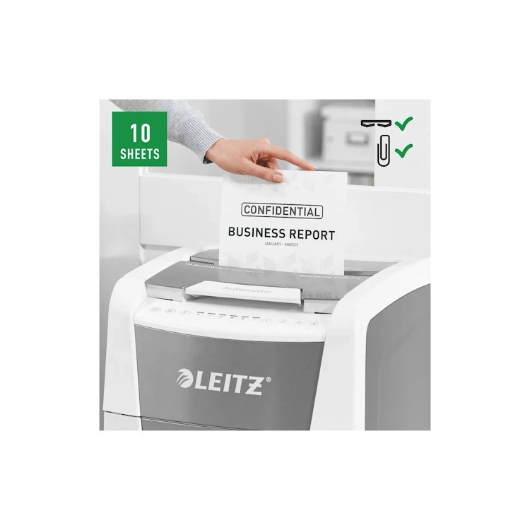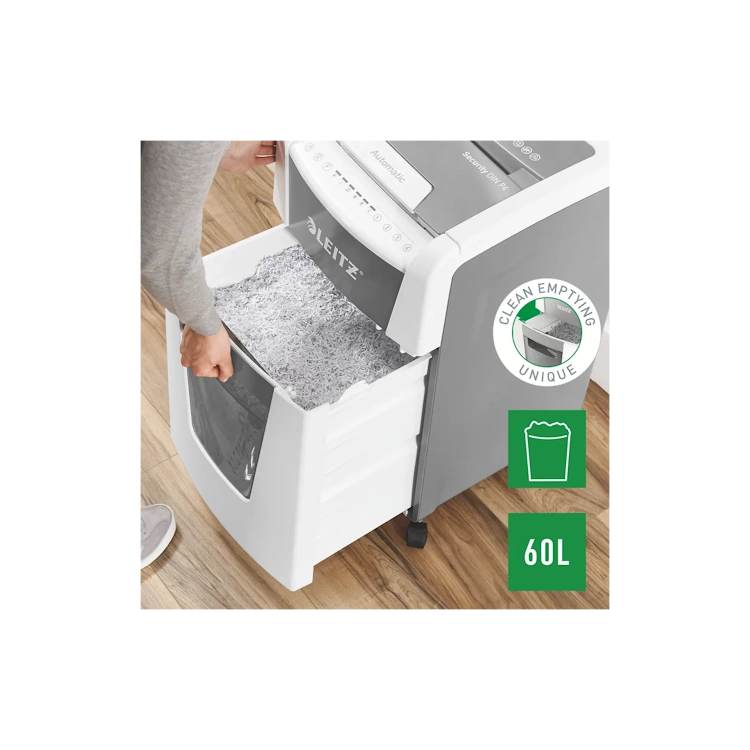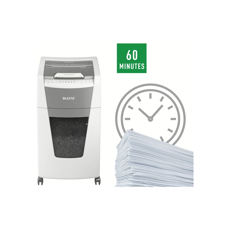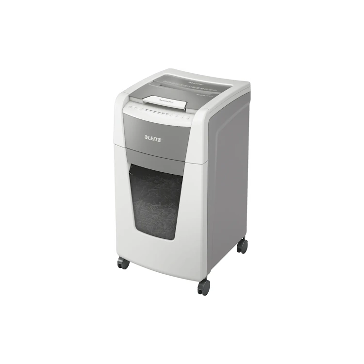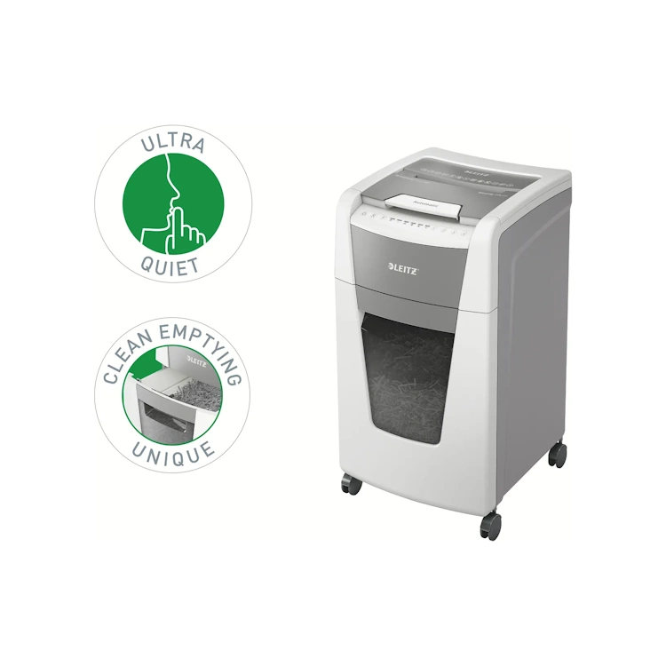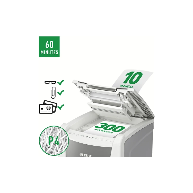 Leitzin täysin automaattinen paperisilppuri on niin älykäs, että se toimii hiljaa itsestään: asetat vain paperipinon (sis. niitit ja paperiliittimet), suljet kannen ja jatkat työntekoasi. Silppuaa yhtäjaksoisesti maksimissaan 300 arkkia (80gsm) turvatason P4 (4x30mm) ristiinleikattua silppua tilavaan 60 litran silppusäiliöön eli se on ihanteellinen toimistokäyttöön. Voit myös silputa papereita manuaalisesti silppurilla (max. 10 arkkia kerrallaan). Silppurissa on jumiutumisen estoteknologia sekä hiljainen ja yhtäjaksoinen 60min silppuaminen automaattitoiminnolla. Leitz IQ silppurit ovat helppokäyttöisiä kosketusnäytön avulla sekä siinä on ainutlaatuinen tyhjennystoiminto.