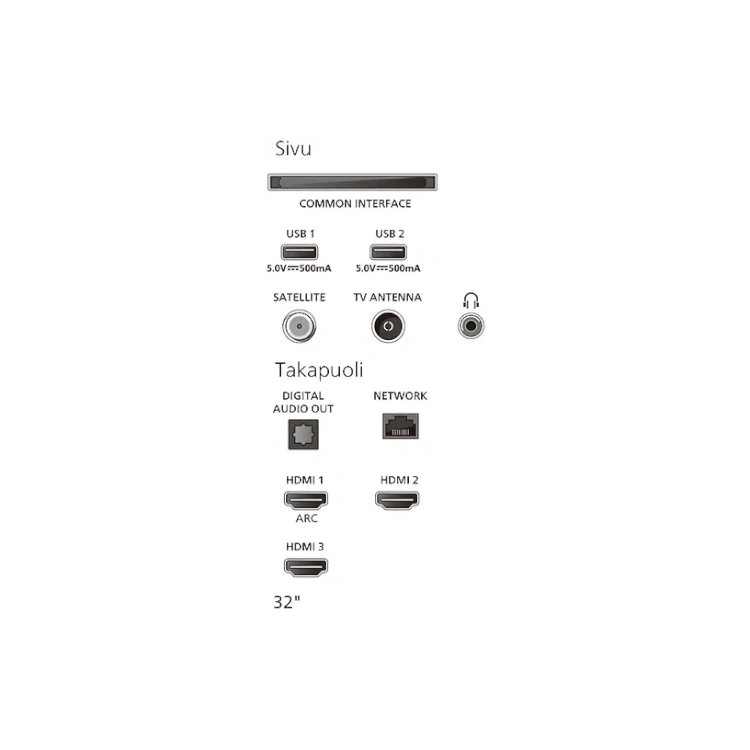 • Digivirittimet: antenni (DVB-T2), kaapeli (DVB-C HD), satelliitti (DVB-S2)