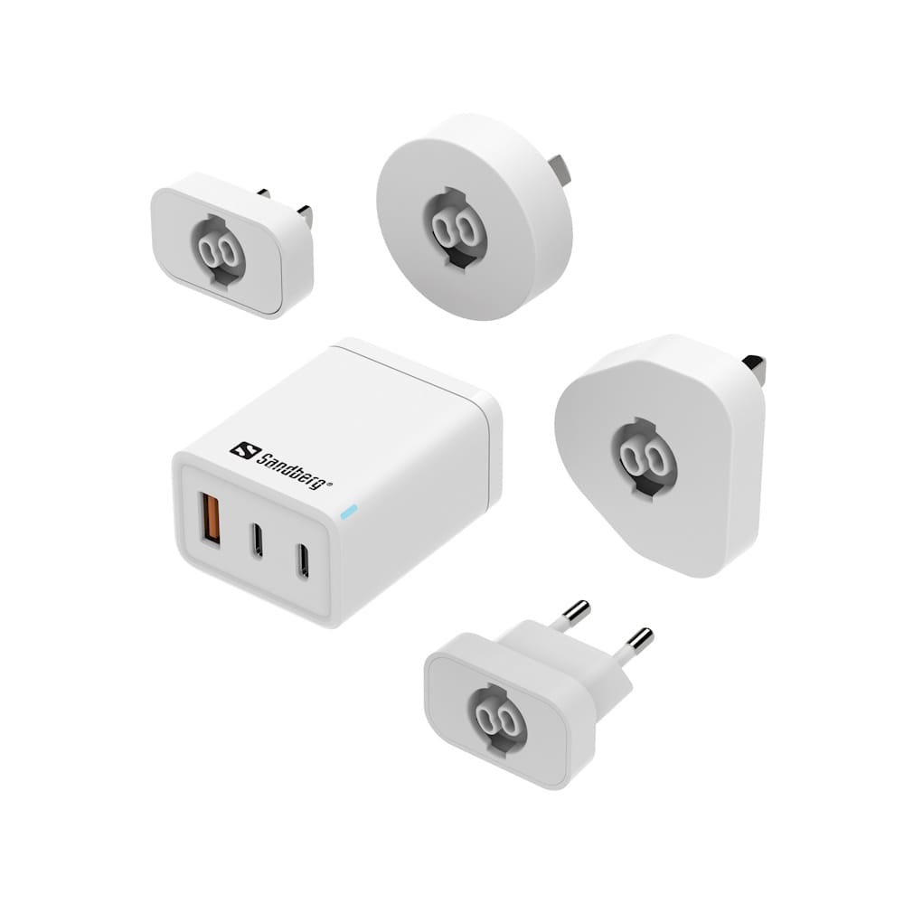 Sandberg 3in1 TravelCharger USB-C/A 65W on kätevä matkalaturi. Sen kahden USB-C PD -liitännän ja yhden USB-A QC -liitännän ansiosta voit ladata jopa 3 älypuhelinta ja/tai tablettia samanaikaisesti, tai yhden kannettavan tietokoneen. Pakkaus sisältää suurimpaan osaan maailmaa soveltuvat virtapistokkeet, joten olet todella hyvin varustettu lähes melkein missä tahansa suoritettavia lataustarpeitasi varten.