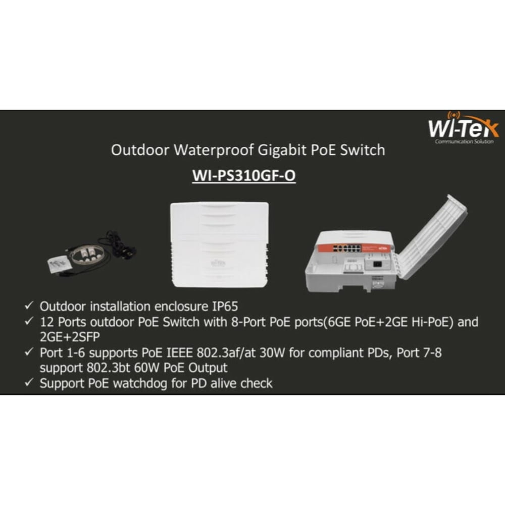 WI-TEKin 10-porttinen PoE-kytkin on rakennettu säänkestävään IP65-koteloon, joten se on täydellinen ratkaisu ulkoisiin asennuksiin. WI-PS310GF-O-kytkin täyttää IEEE 802.3af/at/bt PoE -standardin vaatimukset.
